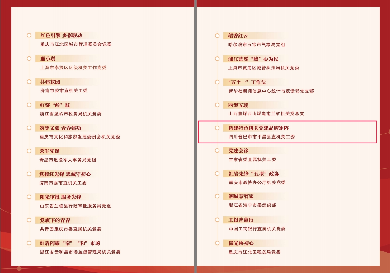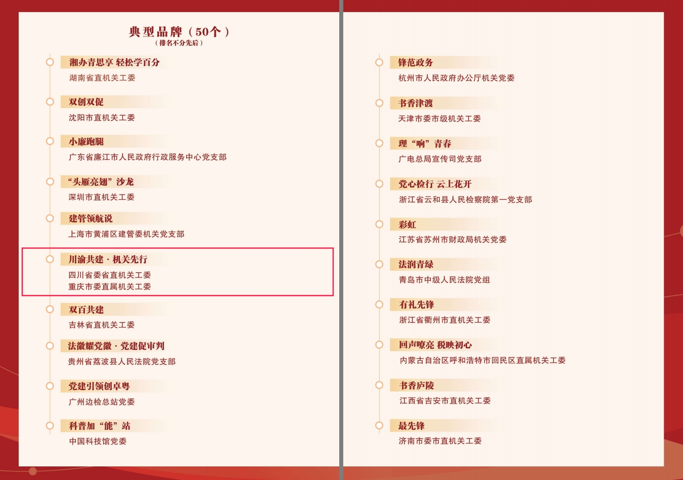 近日,由中央和國家機關工委旗幟雜志社主辦的“共建長江經濟帶·機關黨建做表率”第二屆協作交流暨首屆全國機關黨建品牌發布展示活動在重慶舉行。四川省“川渝共建·機關先行”等9個品牌從全國近3000個黨建品牌中脫穎而出,榮獲全國優秀黨建品牌,獲得示范品牌1個、典型品牌1個、優秀品牌7個的優秀成績,獲評數量位居全國前列。