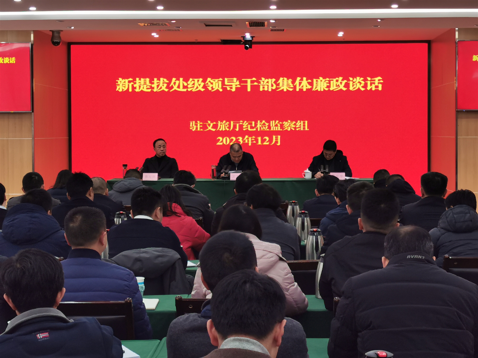 為了增強干部廉潔自律意識,自覺提高拒腐防變能力,做到廉潔勤政,行穩致遠,2023年12月22日,文化和旅游廳針對近三年來新提拔的處級領導干部召開集體廉政談話會,省紀委監委駐文化和旅游廳紀檢監察組組長、廳黨組成員沈萬強同志主持會議并講話。
