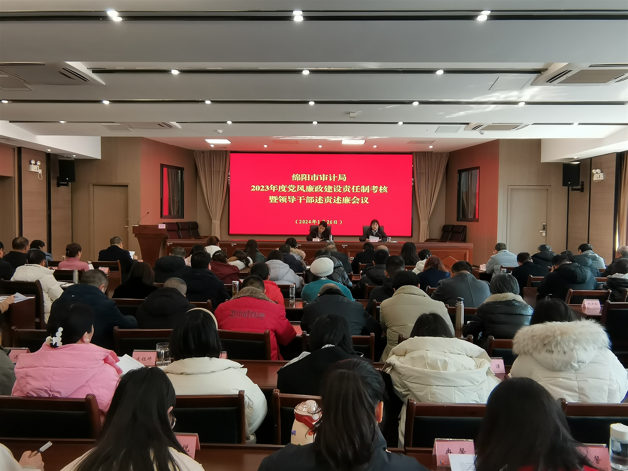 1月26日,綿陽市審計局召開2023年度黨風廉政建設責任制考核暨領導干部述責述廉會,局黨組書記、局長徐強主持會議,市紀委監委駐市國資委紀檢監察組到會指導并開展節前集體廉政談話,局領導班子成員、機關全體干部職工、退休干部代表、服務對象代表80余人參加會議。