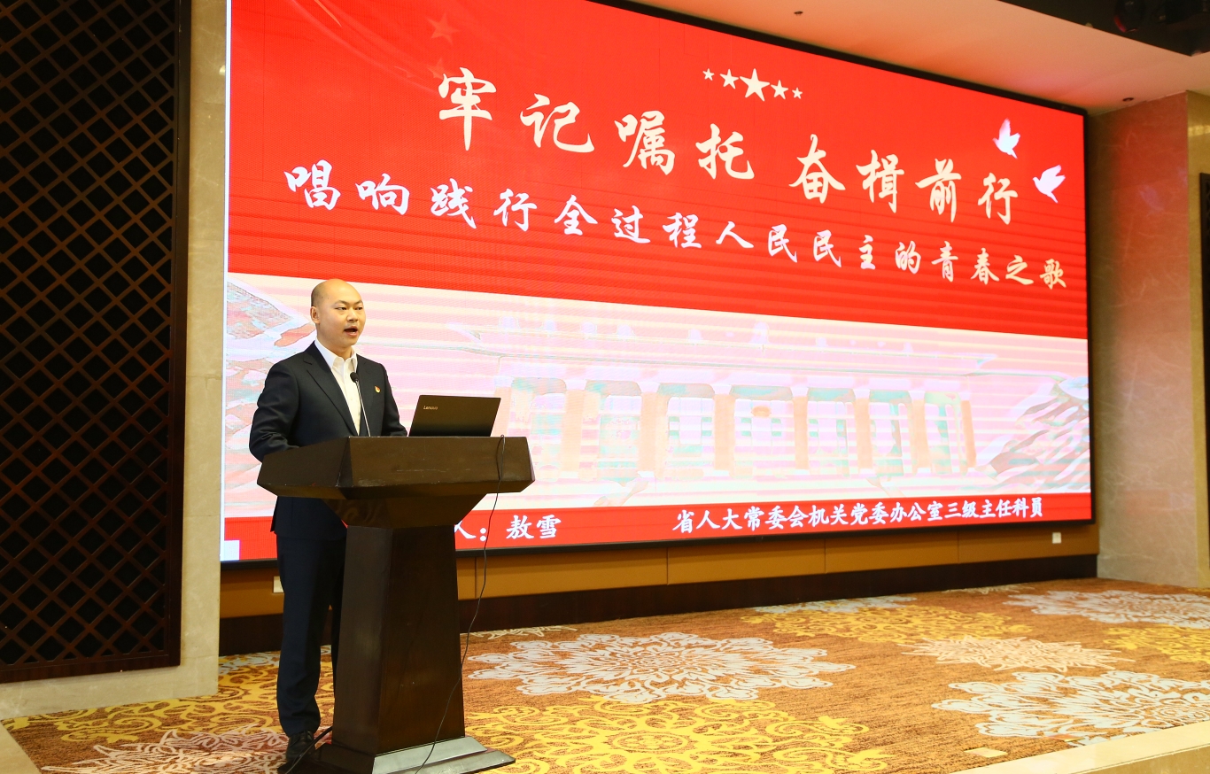 人民民主是永恒主題,全過程人民民主是時代課題。人大機關在全過程人民民主的壯闊事業中,責任重大、使命光榮。習近平總書記在中央人大工作會議上,提出建設“四個機關”和打造“政治堅定、服務人民、尊崇法治、發揚民主、勤勉盡責”人大工作隊伍,進一步對加強新時代人大自身建設提出了新定位和新要求。新時代人大工作大有作為,近年來,新進機關的公務員都是“80后”“90后”,他們為發展中國特色社會主義民主政治事業注入了“源頭活水”。我們在省直機關工委的指導下,跨部門搭建了7個青年理論學習小組,探索建立“四學聯動”機制,積極為青年同志的成長搭建鍛煉平臺。作為人大機關青年,更應知恩感恩、知責履責、知重負重,不負青春韶華,不負偉大時代,為全過程人民民主壯闊事業奏響青春的華章!