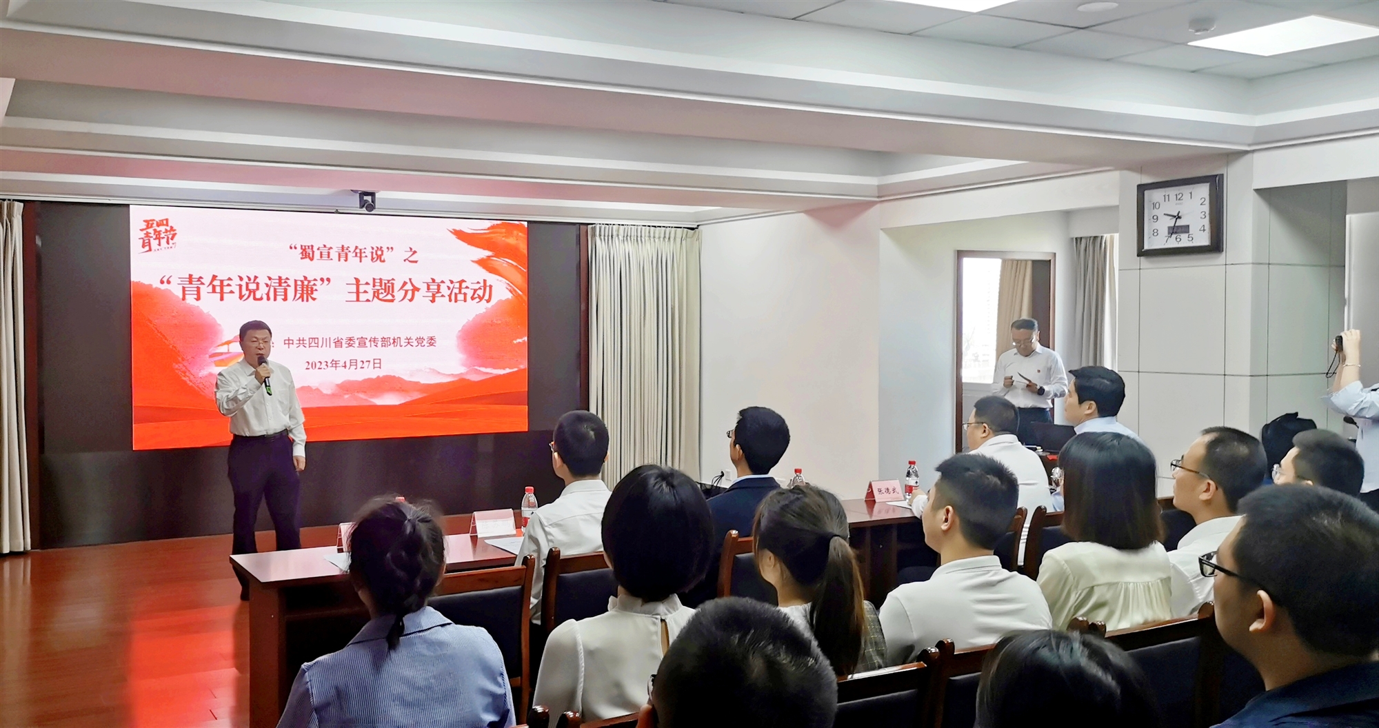 為深入學習貫徹習近平總書記關于黨風廉政建設、廉潔文化建設的重要論述精神,深入開展學習貫徹習近平新時代中國特色社會主義思想主題教育,持續深化“蜀宣青年說”品牌創建,4月27日,在五四青年節即將來臨之際,省委宣傳部開展了“青年說清廉”主題分享活動,青年理論學習小組部分成員以演講形式,講述青年擔當、展示青年風采。省委宣傳部機關黨委書記孟華出席活動并致辭,部機關及直屬事業單位、駐部紀檢監察組60余人參加活動。
